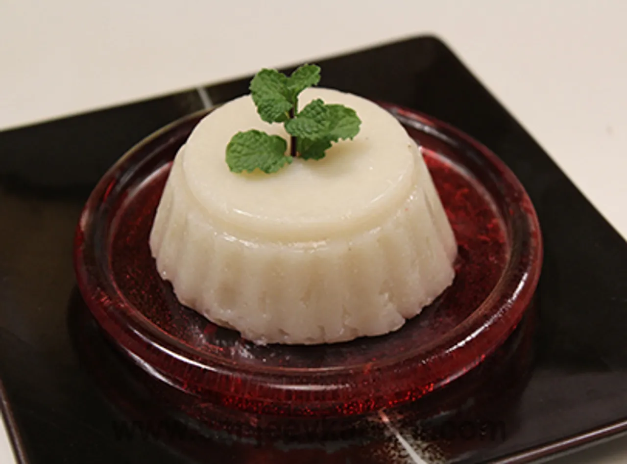 - Add almond essence, mix well and pour into greased jelly moulds. Keep the moulds in the refrigerator for thirty minutes to set.