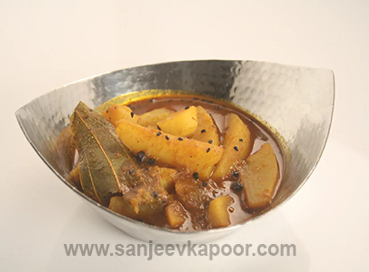 - Heat mustard oil in a non-stick pan. Add bay leaves and sauté. Cut potatoes into wedges.