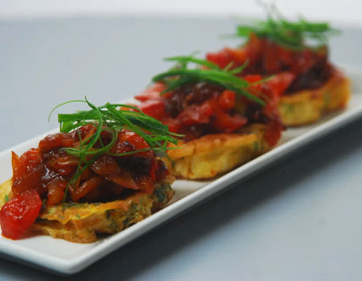 - Place the French toasts on serving plates, spread the tomato mixture over each of them, garnish with spring onion green strips and serve immediately.