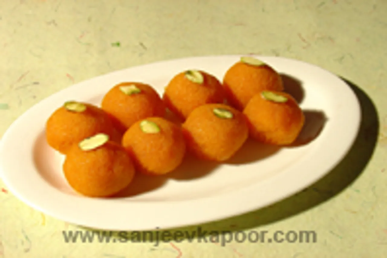 - Squeeze out the excess sugar syrup and shape them into sixteen lemon-sized laddoo.