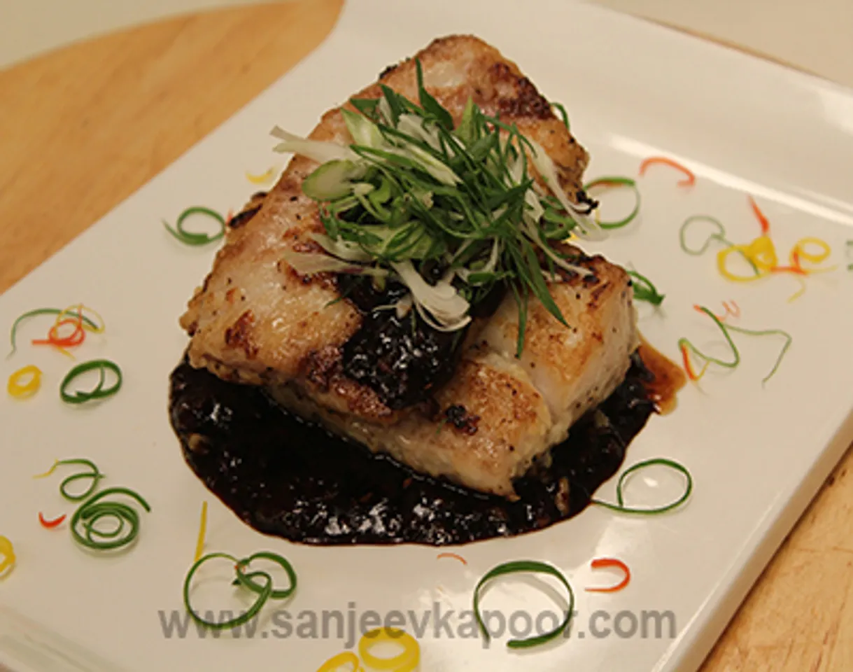 - Place a ring mould on a serving plate and pour the sauce in it. Remove the mould, place seared fish on it. Top with some more sauce and serve immediately garnished with spring onions.